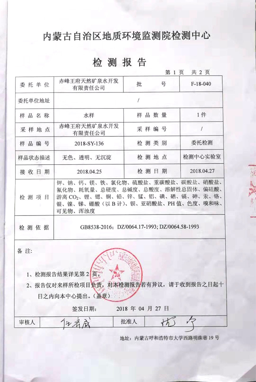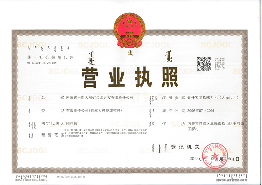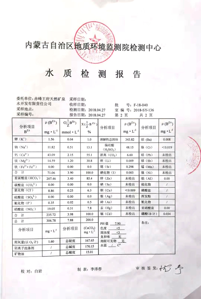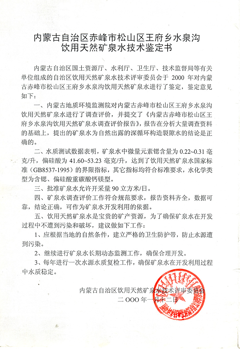赤峰王府天然礦泉水開�(fā)有限責任公司是內(nèi)蒙古自治區(qū)礦泉水行�(yè)的龍頭企�(yè)。也是內(nèi)蒙古一家擁有采礦許可證和礦泉水注冊登記證的礦泉水生�(chǎn)企業(yè)。公司水源地坐落在赤峰市松山區(qū)王府�(zhèn),水源地泉水素有“長壽泉”之稱。那里回峰疊嶂,藍天白云,芳草綠地。境�(nèi)廣大區(qū)域未受過任何工業(yè)污染和環(huán)境污染,保持著水的原生態(tài)。公司始建于2006�8月,�(jīng)�(nèi)蒙古水文地質(zhì)勘測院連續(xù)一年的�(jiān)測,認為此水為鍶、偏硅酸復合�飲用天然礦泉水,符合國家礦泉水標準�2008年公司正式投�(chǎn),注冊資�1066萬元。水是生命之源,公司伊始,就以關注人類健康為己任,注重產(chǎn)品質(zhì)量,追求科技進步,引進國�(nèi)外先進的技術設備。在生產(chǎn)過程中,對廠房環(huán)境、生�(chǎn)條件、生�(chǎn)設施、工藝流程均做了嚴格控制。在確保原生�(tài)天然礦泉水水�(zhì)不變的前提下,進行無菌灌裝,保證“松州泉”天然礦泉水天然、衛(wèi)生、安全。每批次�(chǎn)品都要經(jīng)檢測合格,方可投入市場� 公司立足高起點、高品質(zhì),穩(wěn)步發(fā)展。注重產(chǎn)品的�(nèi)在品�(zhì),努力把“松州泉”天然優(yōu)�(zhì)礦泉水打造成中國的世界級�(yōu)�(zhì)天然礦泉水。為人類奉獻“天然凈化、天然礦化、衛(wèi)生、安全”的健康水。為人類的健康保駕護航�